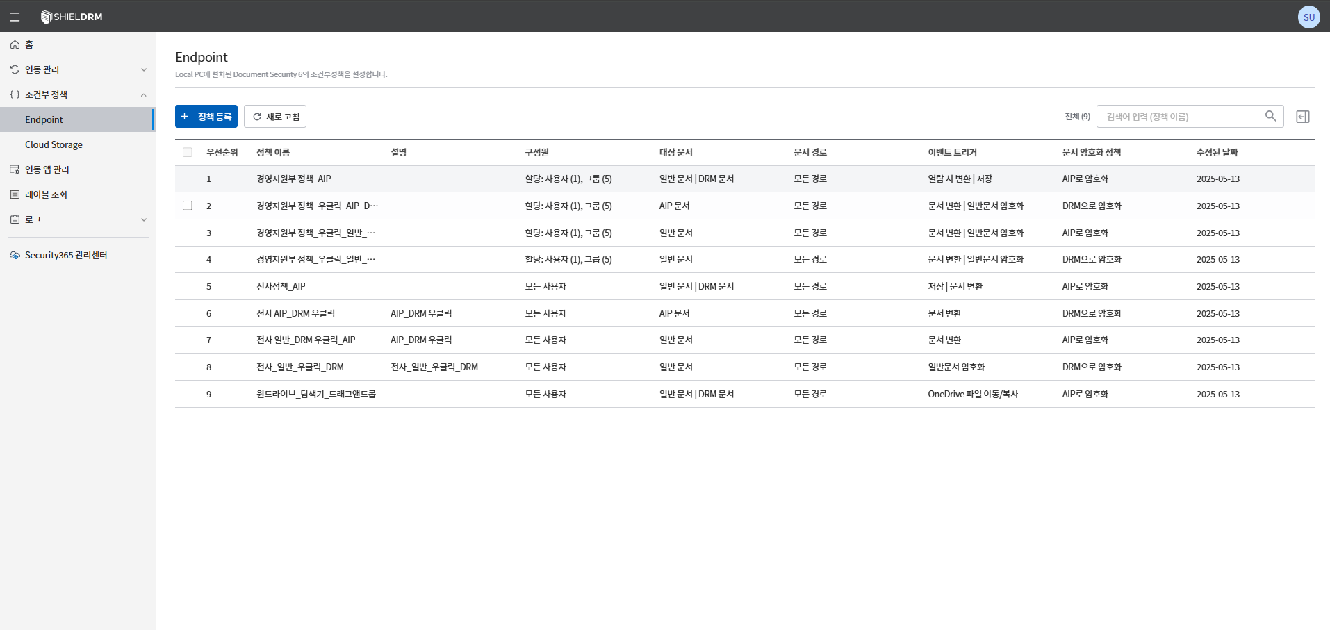 ガイドウェブコンソールガイド条件付きポリシー条件付きポリシー - Endpoint(DS6)このページの見出し条件付きポリシー - Endpointメニューガイド(修正中) ※ 最終更新:2025-05-21 Endpoint条件付きポリシーはLocal PCにインストールされたDocument Security 6で条件付きポリシーを設定し、文書のセキュリティ処理を制御する機能です。 一般文書をAIP文書やDRM文書に変換したり、AIP文書とDRM文書間の相互変換が可能です。 本ガイドはEndpoint条件付きポリシーの構成要素および設定方法を説明します。 Endpoint条件付きポリシー構成要素